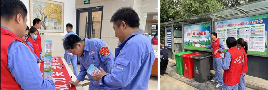 公司组织全体职工开展“我分类、我承诺”活动,主动签署垃圾分类承诺书,广大党员和职工积极参与桶站值守。同时加强与属地街道、属地共建单位横向交流合作,学习先进典型项目的良好工作经验,提升自身垃圾分类工作能力。