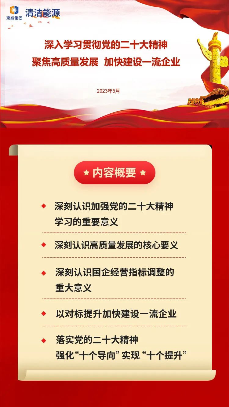 要坚持以习近平新时代中国特色社会主义思想为指引,全面学习、全面把握、全面落实党的二十大精神,聚焦清洁能源高质量发展,强化“十个导向”,实现“十个提升”,加快建设世界一流企业,在新时代的新检验、新考验中交上优异的答卷。